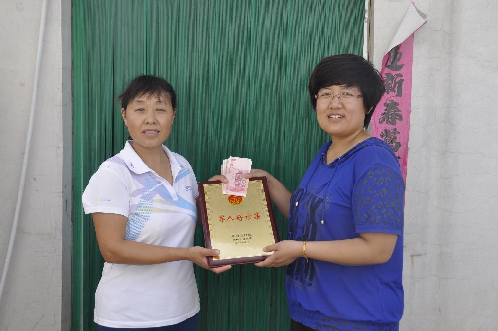 8月1日,在第84个建军节来临之际,黄河口镇军人家属杨平激动地接过“军人好母亲”的奖牌和1000元奖金。今年,垦利县表彰了10名“军人好母亲”和5名“军人好妻子”,号召广大军属和人民群众要以她们为榜样,积极关心和支持国防建设,在全社会形成拥军优属的良好风气。
